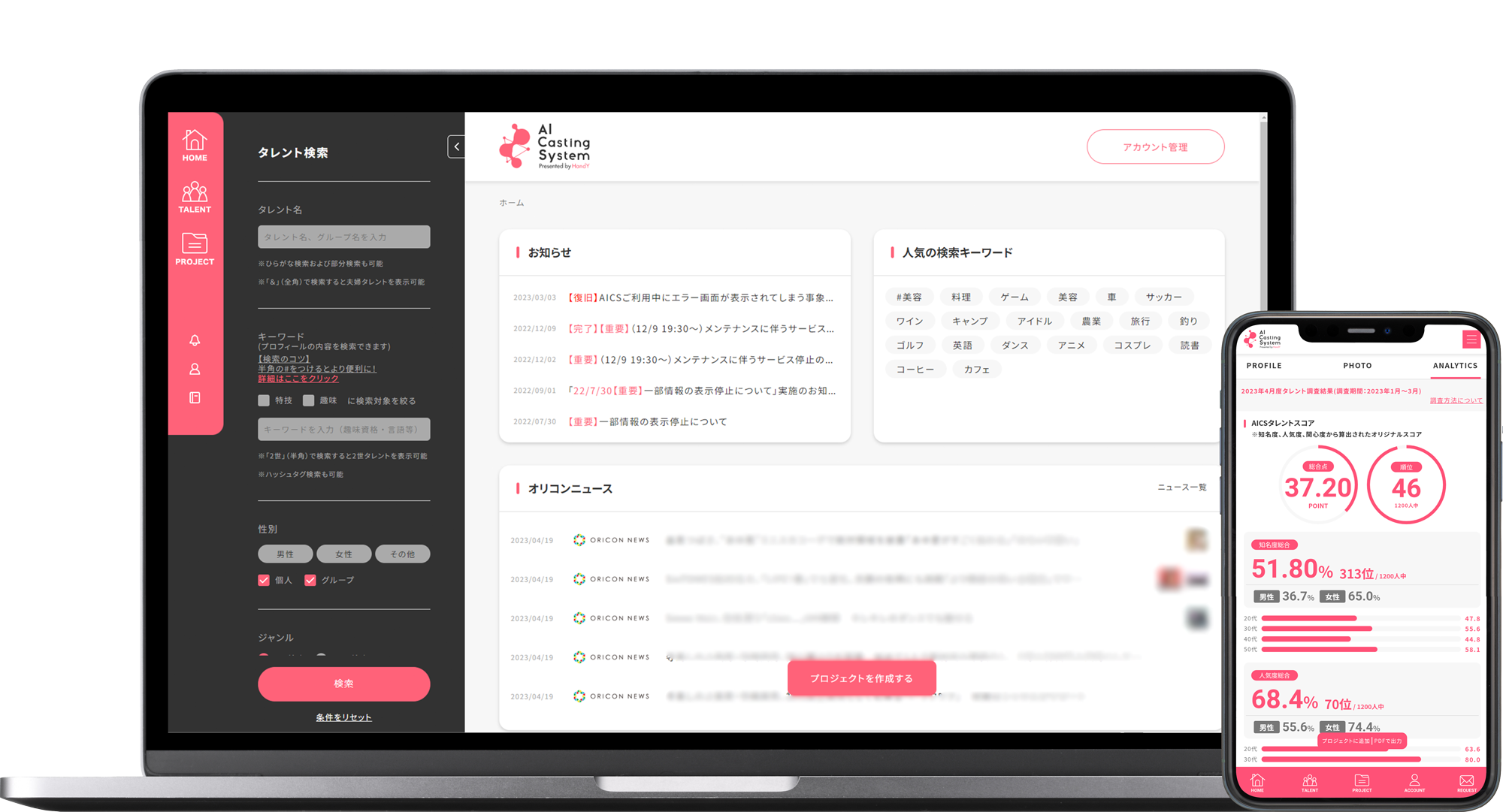 AICSは、AI Casting System® の略で、TV,映画,広告等の案件において、効率的にタレントキャスティングが行えるサポートシステムです。 タレントの検索、資料作成等に特化した便利なサービスとなっています。